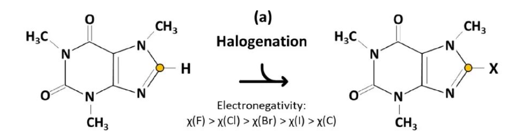 韩国成均馆大学Won-Sub Yoon等人将咖啡因作为电极材料应用于锂电池中,并首次揭示了储能机制。在充放电过程中,两个等效的电子和锂离子参与氧化还原反应,在 1.5–4.3 V 的电压窗口中提供265 mAh g−1的可逆容量。此外,还发现可以通过卤化分子调谐来控制新的氧化还原反应位点,新创建的氧化还原位点表明氧化电压与卤素元素的电负性成比例增加,顺序为I,Br,Cl和F。这些结果证明了天然有机材料作为储能材料的适用性,以及通过分子尺度工程设计可调氧化还原活性位点及其氧化还原电位的可行策略。