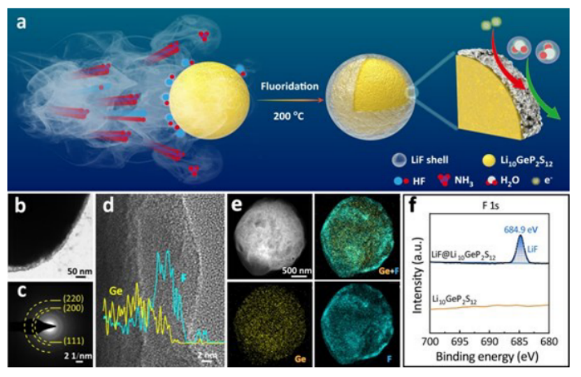 近日,中科院宁波材料所姚霞银研究员团队提出了一种同时可以满足水分和界面稳定性的有效方法,通过气固反应在Li10GeP2S12颗粒的表面引入一层氟化锂涂层,形成了具有核壳结构的固态电解质LiF@Li10GeP2S12。密度函数理论计算验证了具有核壳结构的LiF@Li10GeP2S12有较低的吸附能量,大大抑制了 在Li10GeP2S12中的PS43-的分解。同时,LiF@Li10GeP2S12具有较低的电子传导率,为2.42 × 10-9 S cm-1,可以有效地抑制锂枝晶的增长,并防止锂和LiF@Li10GeP2S12之间的副反应,将临界电流密度从1.0 mA cm-2提高到了3.0 mA cm-2。基于LiF@Li10GeP2S12的全固态锂电池表现出了优异的倍率性能和循环稳定性,组装后的LiNbO3@LiCoO2/LiF@Li10GeP2S12/Li电池在1 C下的初始放电容量为101.0 mAh g-1,循环1000次后容量保持率为94.8%